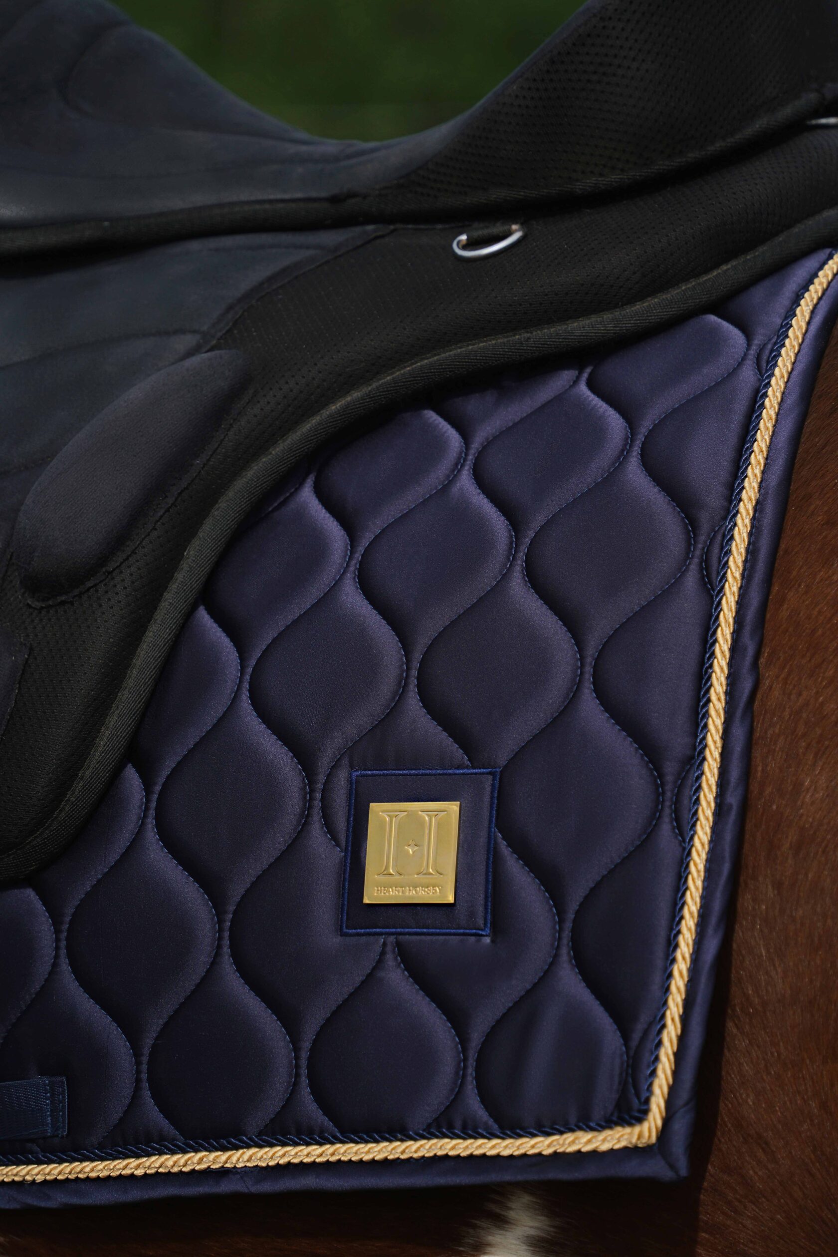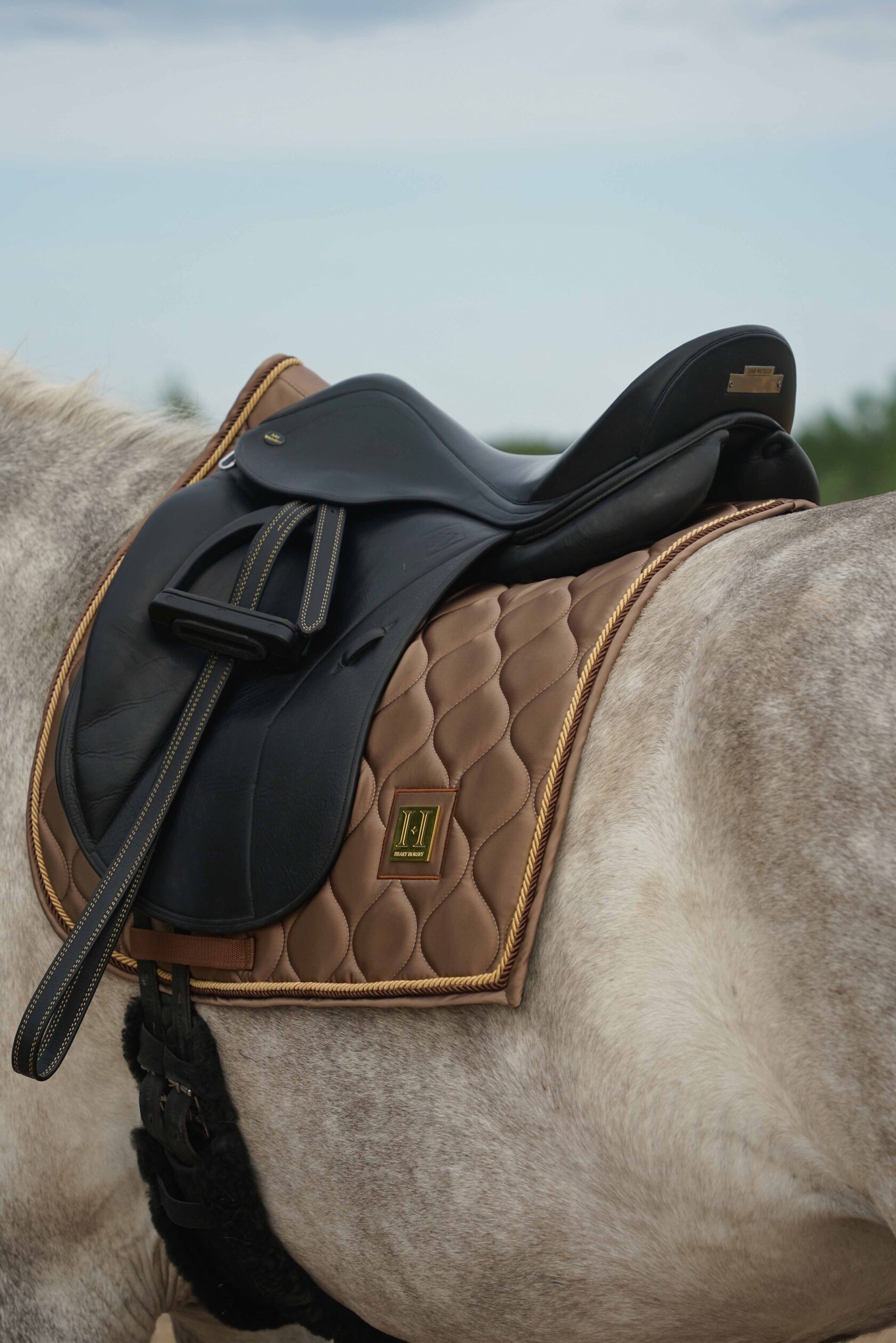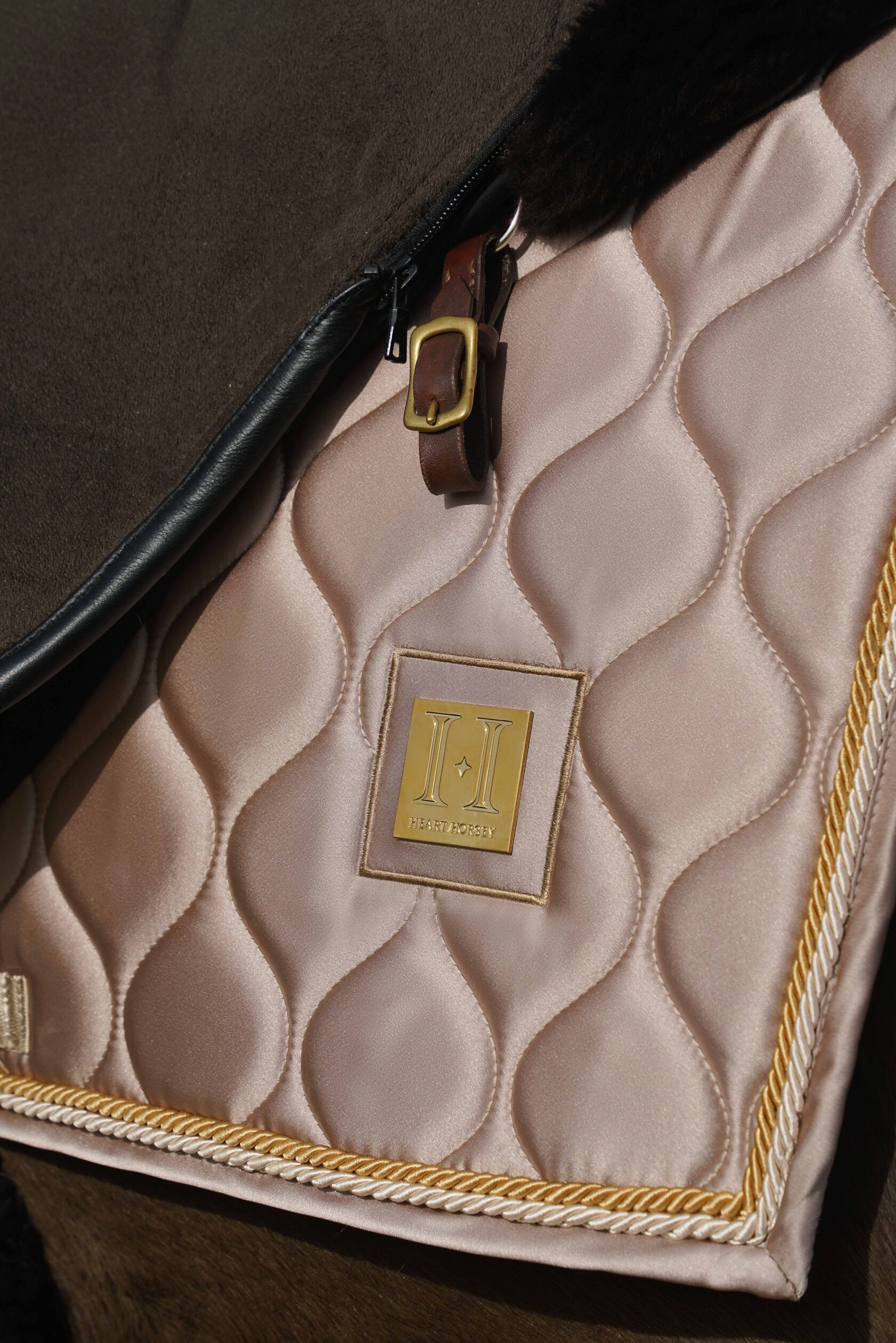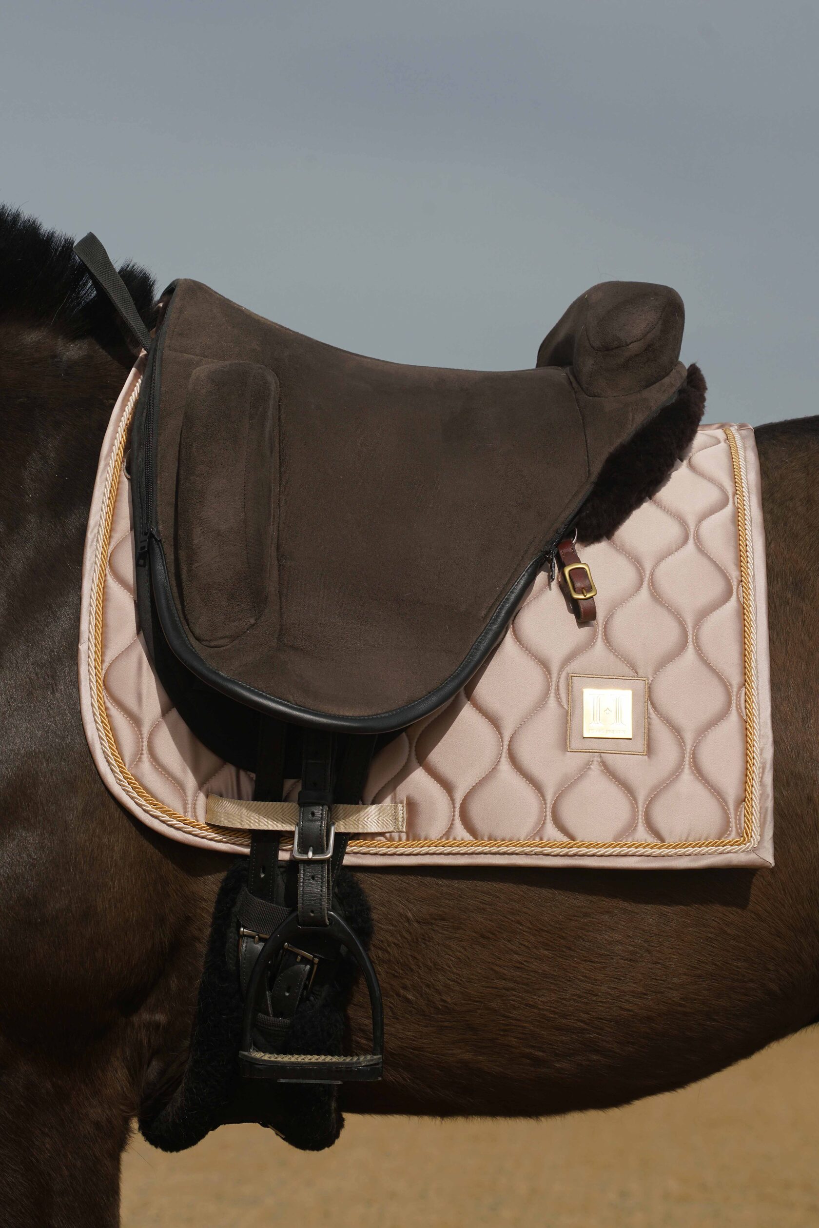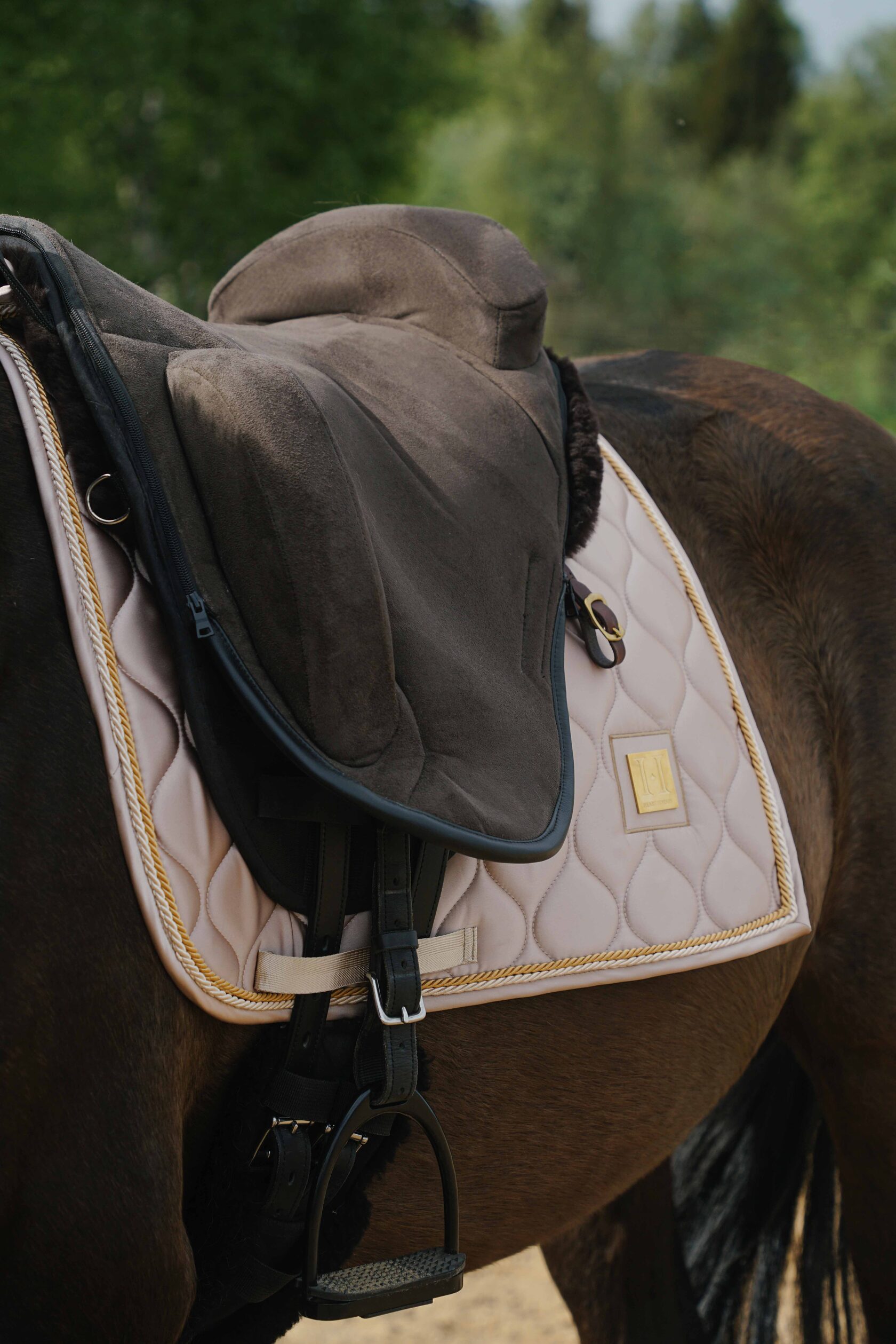 Премиальный вальтрап из светлого атласа для выездки с золотым декоративным шильдом HH