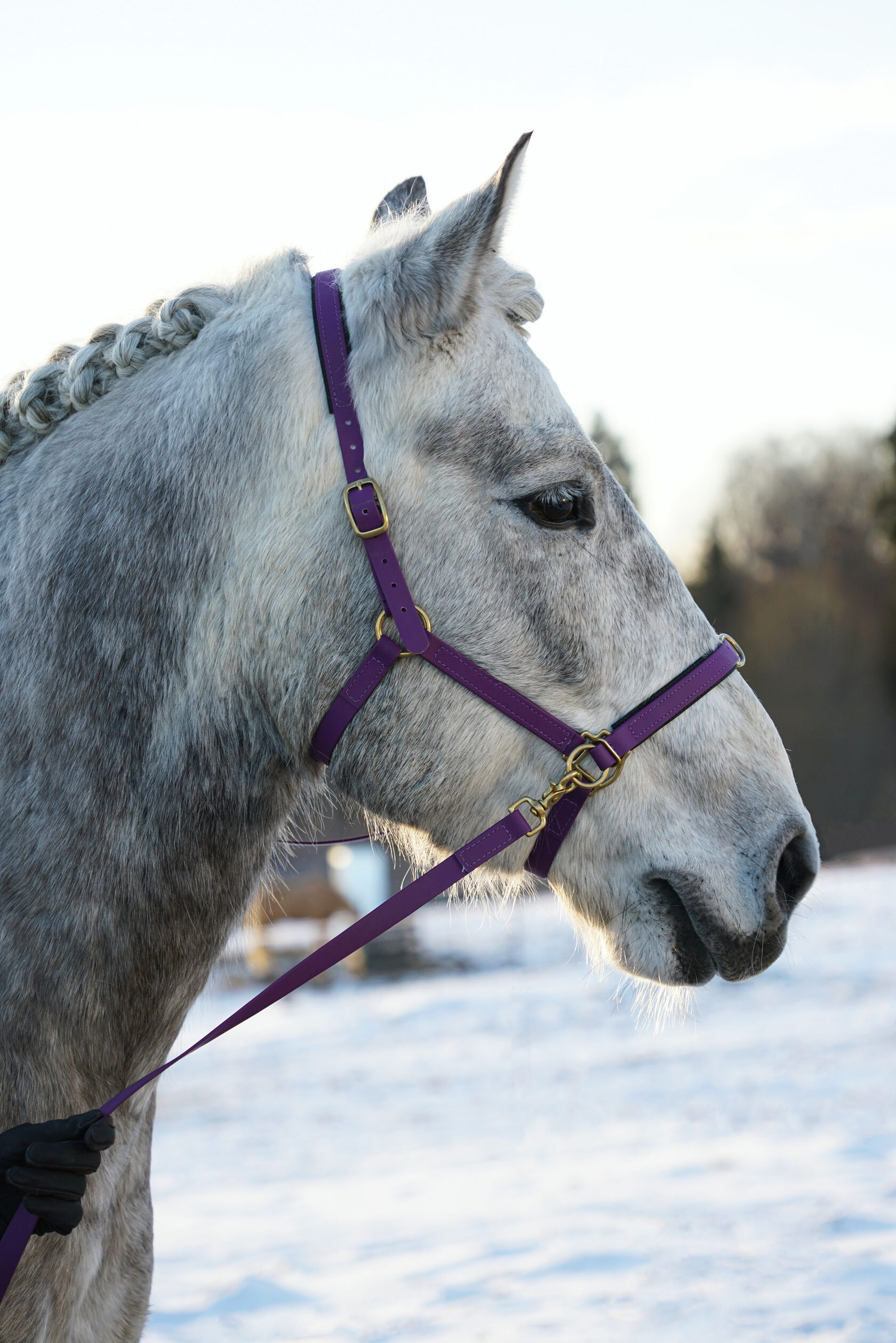 Кавессон из Европейского Биотана в насыщенном фиолетовом цвете с золотой латунной фурнитурой. Размер регулируется по мордочке от COB до FULL Поводья можно заказать отдельно.