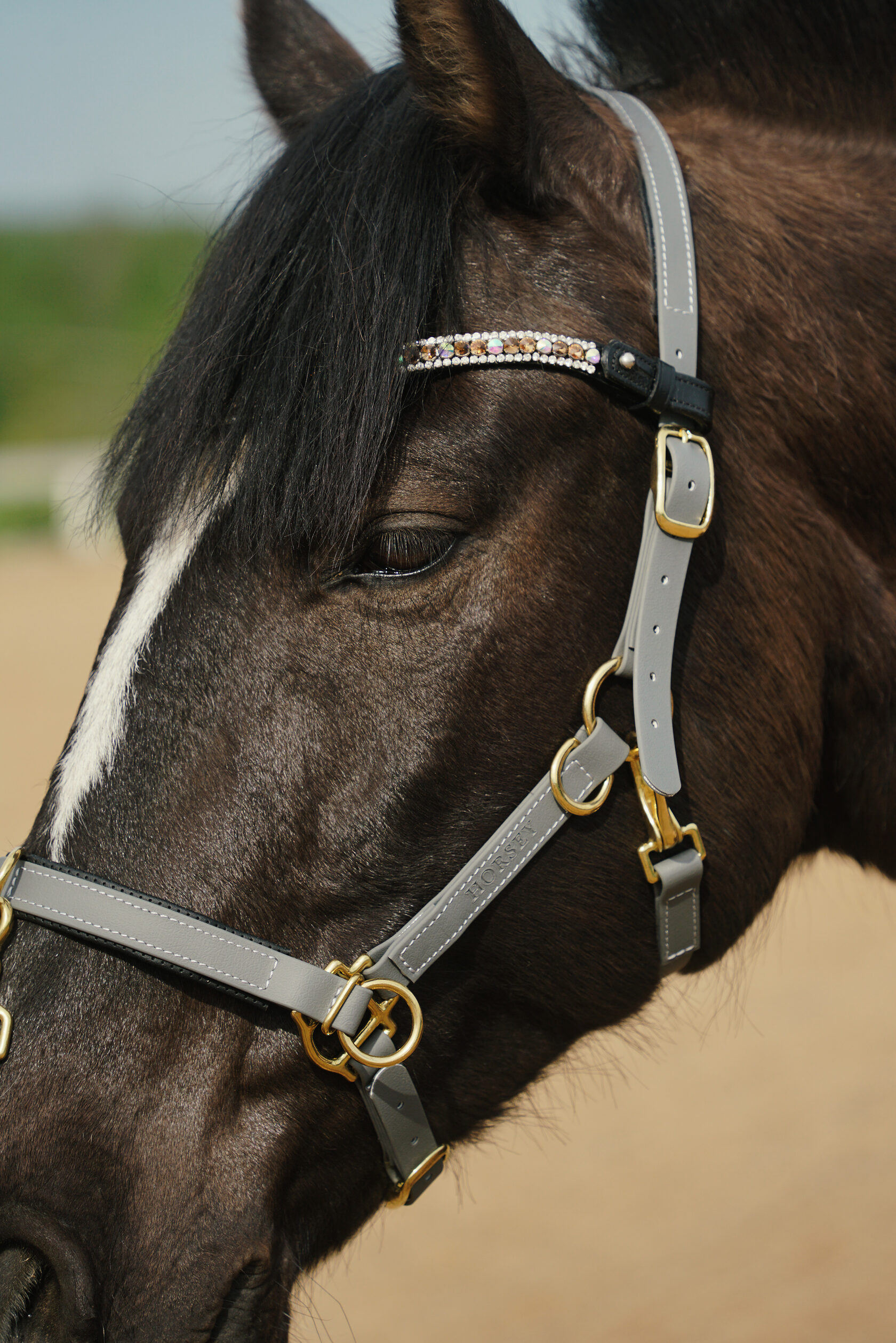 Уникальный цвет кавессона насыщенного оливкового цвета с золотой фурнитурой из европейского Биотана. За ушками и на носу мягкая подкладка из Эко-кожи, которая обеспечивает плотное прилегание Кавессона к мордочки лошади. В комплект можно заказать ремешки для трензеля и поводья. Кавессон мульти размера COB